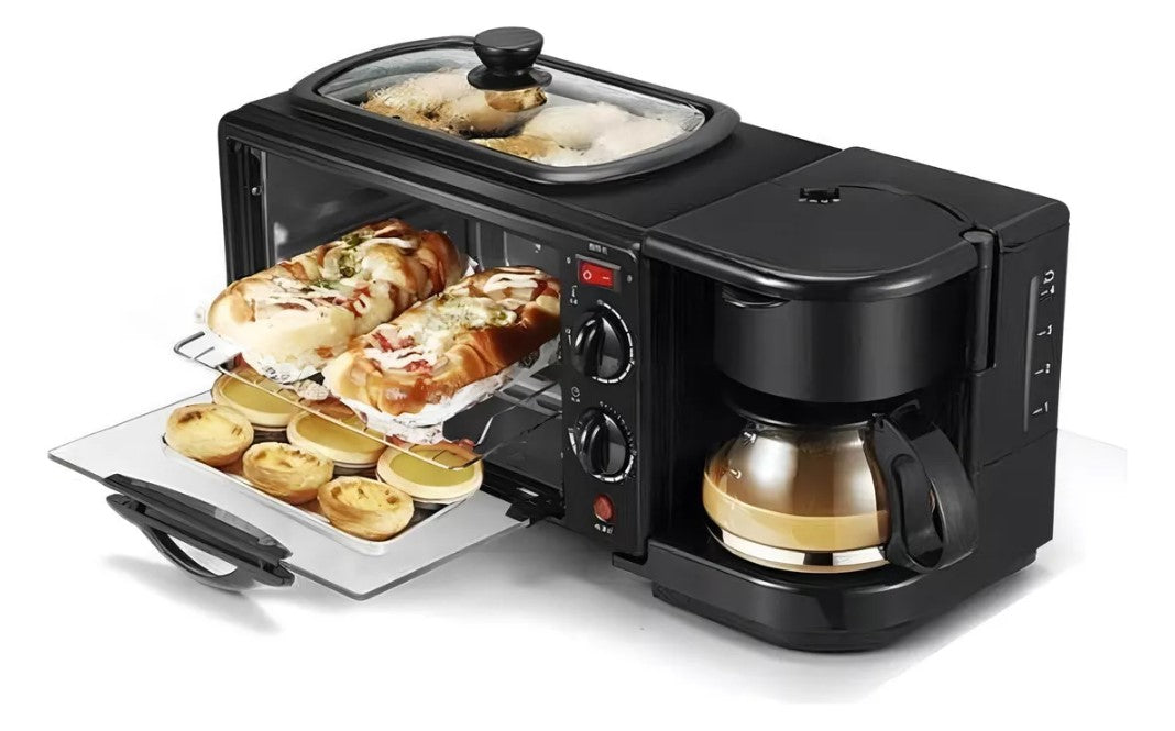 Máquina de Desayuno Multifunción 3 en 1 - Horno Eléctrico, Cafetera y Sartén en una Sola Máquina